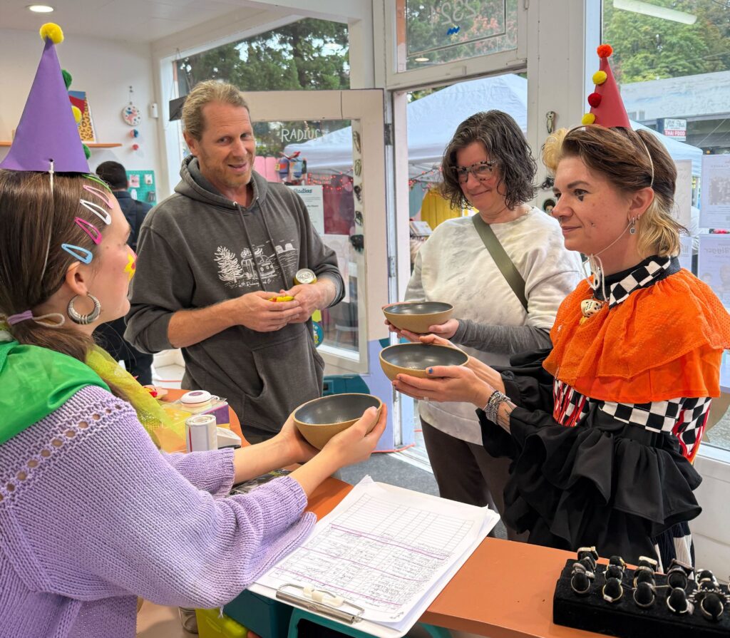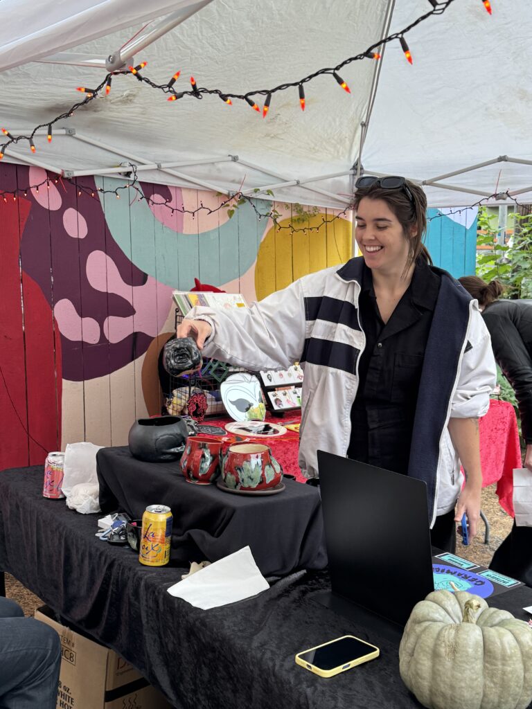 Sometimes it feels like this clay studio is run by a bunch of clowns … in the best way! Last Friday, seven artists set up their ceramics and other handmade crafts out front, neighbors drifted over, and the Radius gallery filled with friends and family cheering on the 40+ artists in this year’s Haunted Hues Gallery Show.